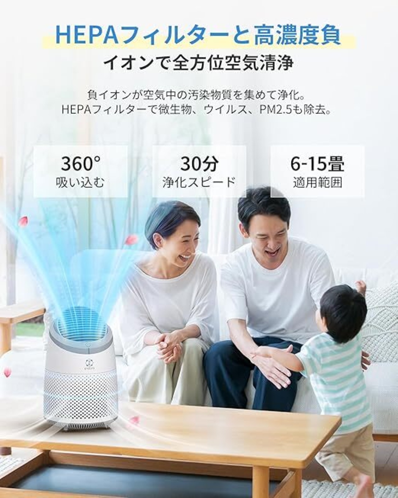 花粉やPM2.5などの微粒子を効果的に除去できるHEPAフィルターを採用しています。