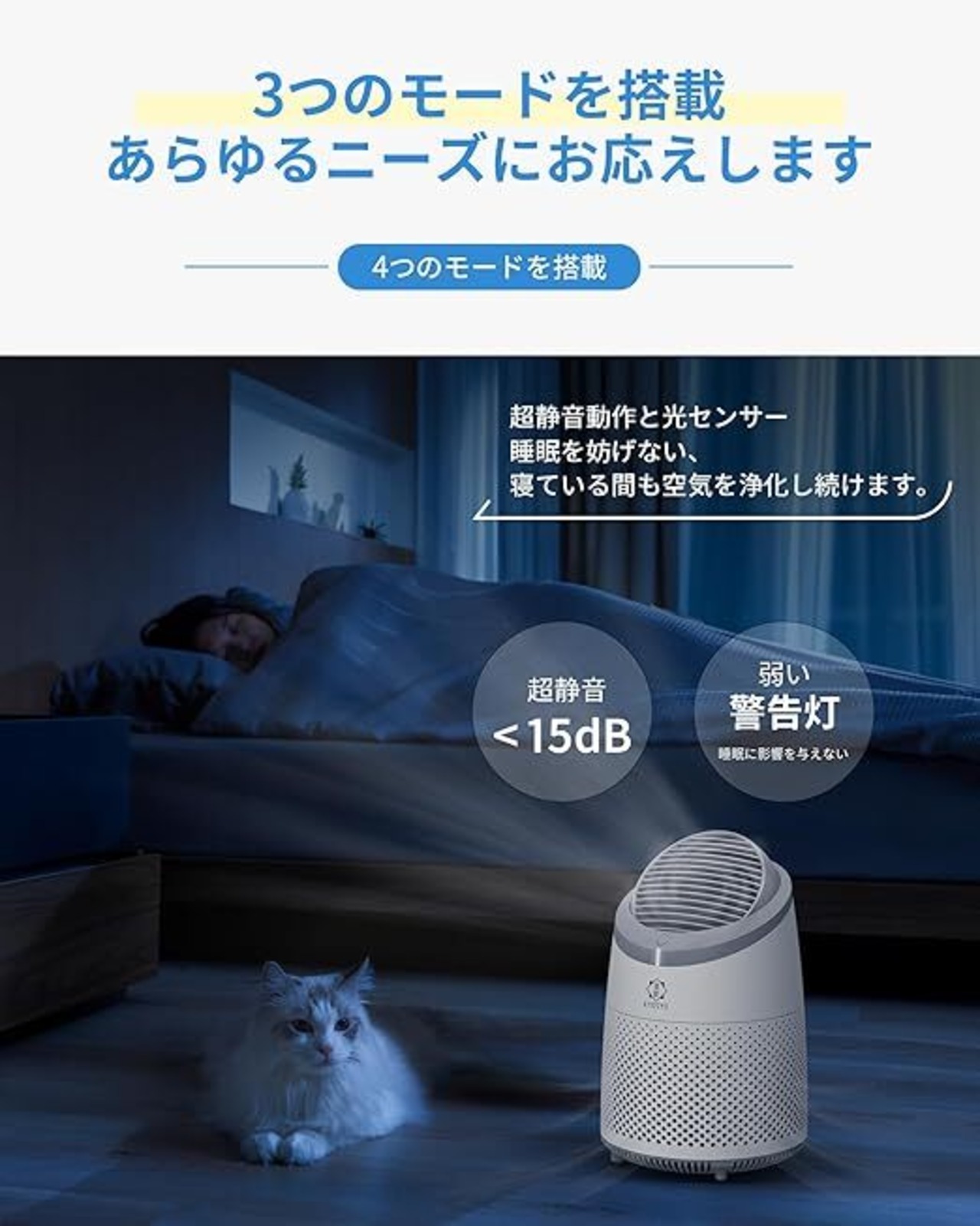 低騒音設計なので、就寝時や読書中などでも気になりません。