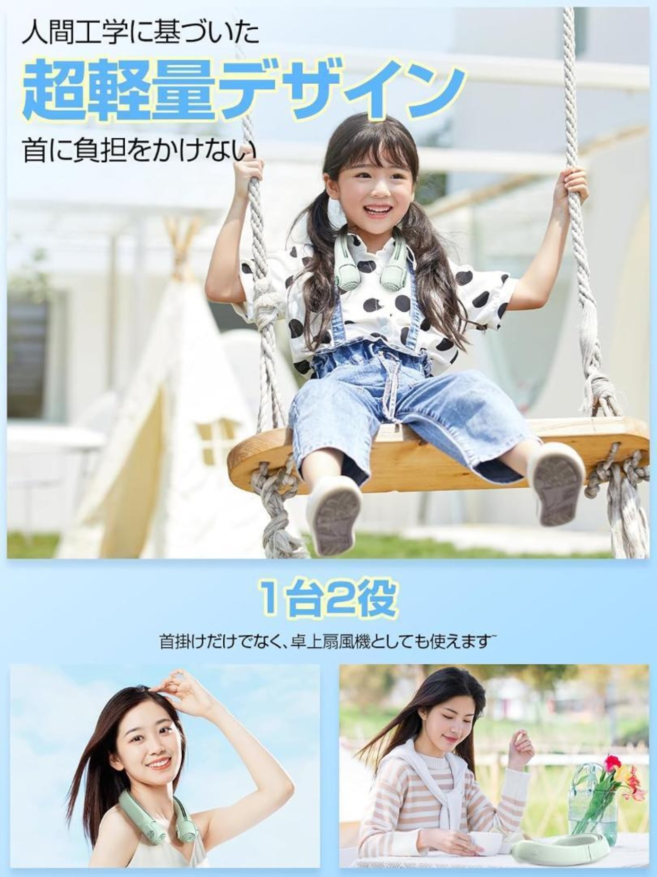 【健康な風!目の乾燥を防ぎ】Alwgreenネックファンは独自の革新的な坂道導風システムにより、ブラシレスDCモーターを採用、大きく広がりゆっくりと進む風がやさしく包みこんでくれる、ムラがないパワフルな風から自然風の風を作り出すので、目の乾燥を防ぎ、暑い夏を乗り越えます! まだ、風向きを自由に調整できるので、直接風が当たらず、1日使っても頭が痛くなりません。